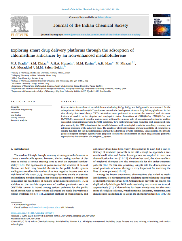 | dc.identifier.citation | M.J. Saadh, S.M. Dhiaa, A.H.A. Hussein, M.M. Karim, A.H. Idan, M. Mirzaei, S.A. Mosaddad, M.M. Salem-Bekhit, (2024). Exploring smart drug delivery platforms through the adsorption of chlormethine anticancer by an iron-enhanced metallofullerene, Journal of the Indian Chemical Society,101 (10). Erişim adresi: https://doi.org/10.1016/j.jics.2024.101294 | |