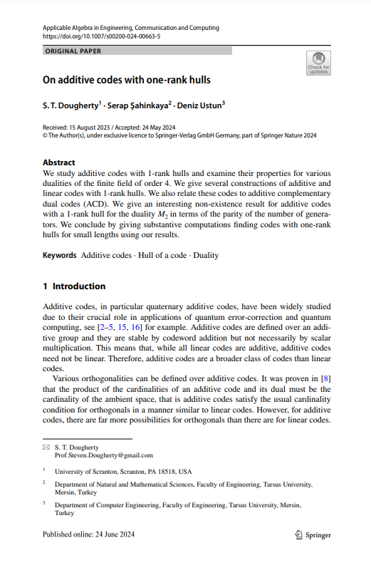 Dougherty, S.T., Şahinkaya, S. ve Ustun, D. (2024). On additive codes with one-rank hulls. AAECC. Erişim adresi: https://doi.org/10.1007/s00200-024-00663-5