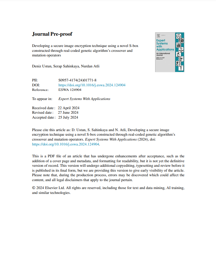 D. Ustun, S. Şahinkaya and N. Atlı, (2024). Developing a secure image encryption technique using a novel S-box constructed through real-coded genetic algorithm’s crossover and mutation operators. Expert Systems With Applications. Doi: https://doi.org/10.1016/j.eswa.2024.124904.