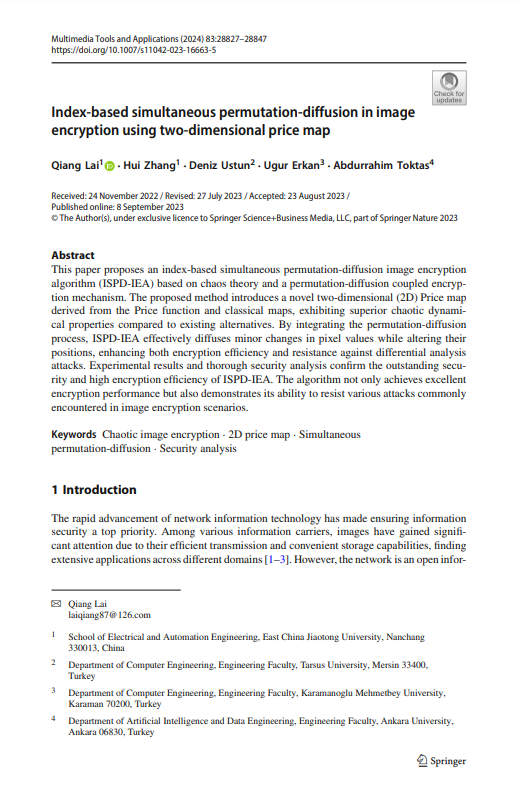 Lai, Q., Zhang, H., Ustun, D., Erkan, U., Toktas,A. (2024). Index-based simultaneous permutation-diffusion in image encryption using two-dimensional price map. Multimed Tools Appl 83, 28827–28847. Erişiim adresi: https://doi.org/10.1007/s11042-023-16663-5