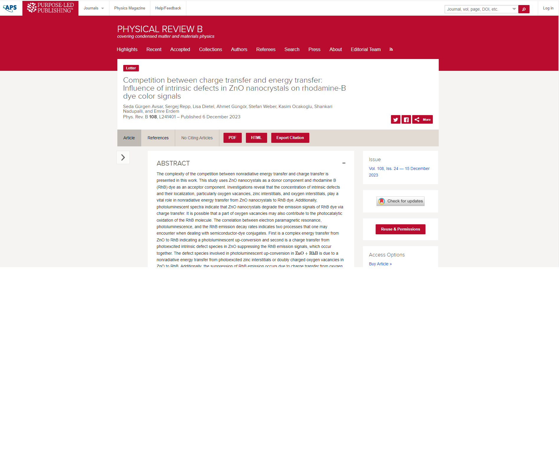 Avsar, S. G., Repp, S., Dietel, L., Gungor, A., Weber, S., Ocakoglu, K., Nadupalli, S. ve Erdem, E. (2023). Competition between charge transfer and energy transfer: Influence of intrinsic defects in ZnO nanocrystals on rhodamine-B dye color signals, Physical Review B, 108 (24), DOI: 10.1103/PhysRevB.108.