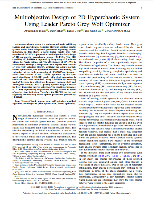 Toktas A., Erkan U., Ustun D., Lai Q.(2024).Multiobjective Design of 2D Hyperchaotic System Using Leader Pareto Grey Wolf Optimizer, IEEE Transactions on Systems, Man, and Cybernetics: Systems, s. 1-11, DOI: 10.1109/TSMC.2024.3401412