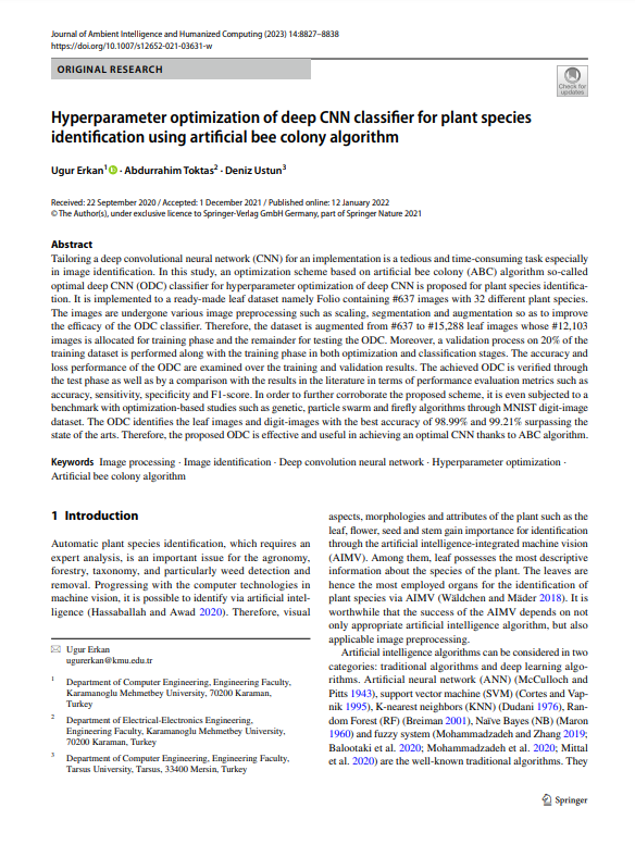 Erkan, U., Toktas, A. ve Ustun, D. (2023). Hyperparameter optimization of deep CNN classifier for plant species identification using artificial bee colony algorithm. J Ambient Intell Human Comput 14, 8827–8838. Erişim adresi: https://doi.org/10.1007/s12652-021-03631-w