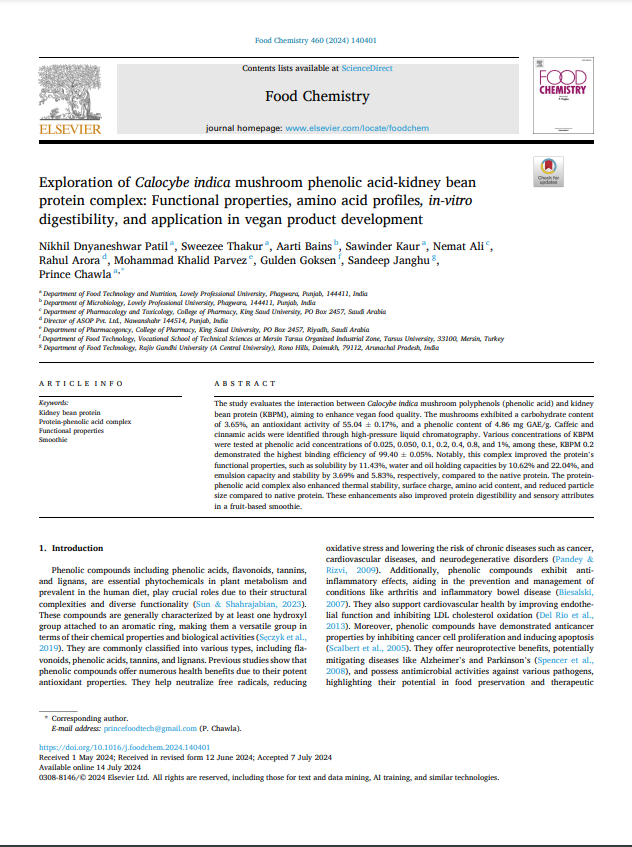 The study evaluates the interaction between Calocybe indica mushroom polyphenols (phenolic acid) and kidney bean protein (KBPM), aiming to enhance vegan food quality. The mushrooms exhibited a carbohydrate content of 3.65%, an antioxidant activity of 55.04 ± 0.17%, and a phenolic content of 4.86 mg GAE/g. Caffeic and cinnamic acids were identified through high-pressure liquid chromatography. Various concentrations of KBPM were tested at phenolic acid concentrations of 0.025, 0.050, 0.1, 0.2, 0.4, 0.8, and 1%, among these, KBPM 0.2 demonstrated the highest binding efficiency of 99.40 ± 0.05%. Notably, this complex improved the protein's functional properties, such as solubility by 11.43%, water and oil holding capacities by 10.62% and 22.04%, and emulsion capacity and stability by 3.69% and 5.83%, respectively, compared to the native protein. The protein-phenolic acid complex also enhanced thermal stability, surface charge, amino acid content, and reduced particle size compared to native protein. These enhancements also improved protein digestibility and sensory attributes in a fruit-based smoothie.