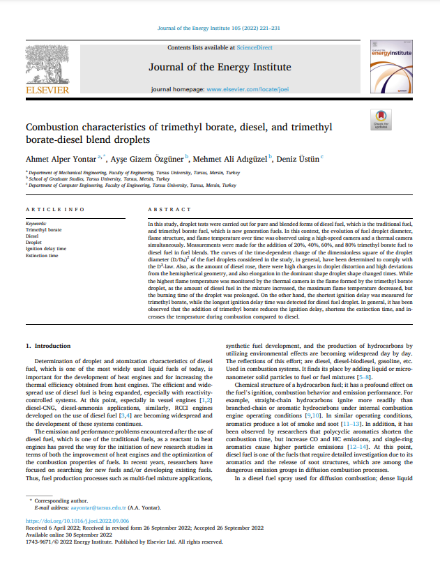Yontar, A.A., Özgüner, A.G., Adıgüzel, M. A. ve Üstün, D. (2022). Combustion characteristics of trimethyl borate, diesel, and trimethyl borate-diesel blend droplets, Journal of the Energy Institute, 105, 221-231,