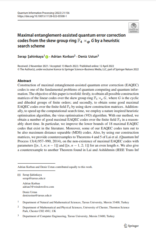Şahinkaya, S., Korban, A. ve Ustun, D. (2022). Maximal entanglement-assisted quantum error correction codes from the skew group ring F4 (sic)? G by a heuristic search scheme. Quantum Inf Process 21, (4), 156 (2022). Erişim adresi: https://doi.org/10.1007/s11128-022-03500-1