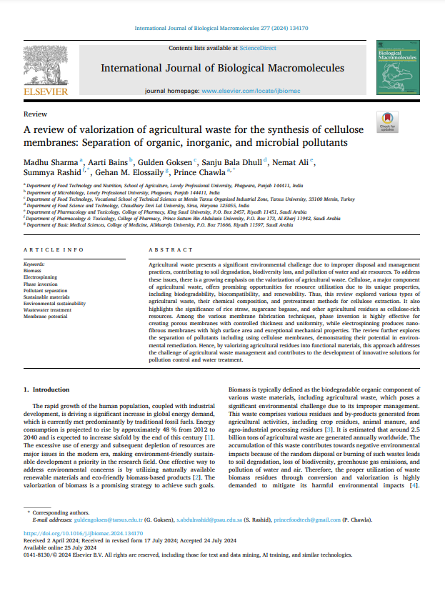 Sharma, M., Bains, A., Goksen, G., v.d. (2024). A review of valorization of agricultural waste for the synthesis of cellulose membranes: Separation of organic, inorganic, and microbial pollutants, International Journal of Biological Macromolecules, 277 (2). Erişim adresi: https://doi.org/10.1016/j.ijbiomac.2024.134170