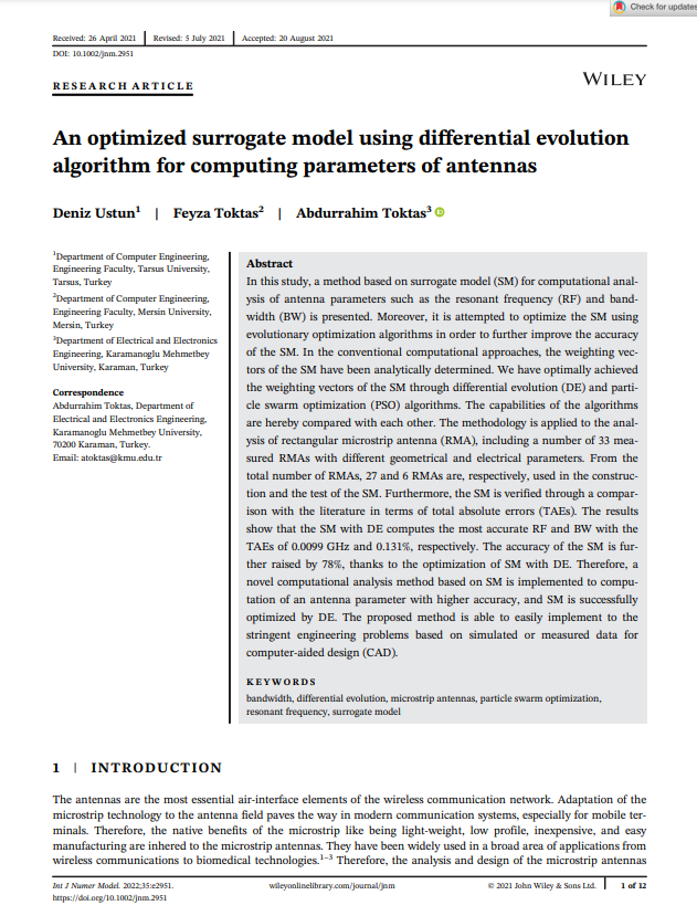 | dc.identifier.citation | Üstün, D. Toktaş, F. ve Toktaş, A. (2022). An optimized surrogate model using differential evolution algorithm for computing parameters of antennas. International Journal of Numerical Modelling-Electronic Networks Devices and Fields, 35,2, 1-12. | |