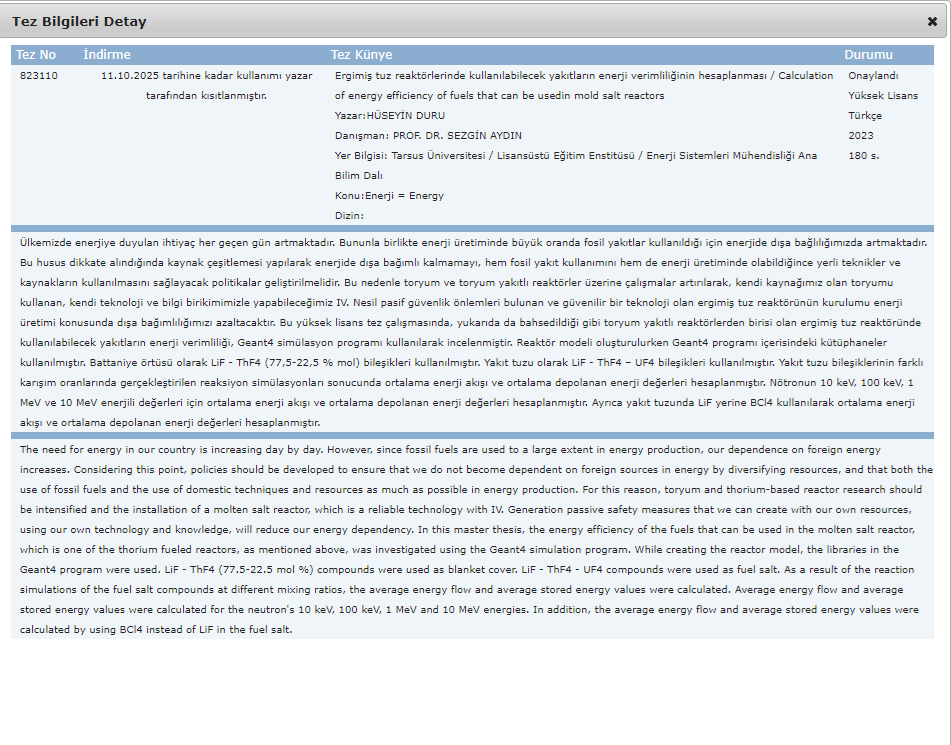Duru, H. Ergimiş tuz reaktörlerinde kullanılabilecek yakıtların enerji verimliliğinin hesaplanması, Tarsus Üniversitesi, 2023, (Yayınlanmamış Yüksek Lisans Tezi)