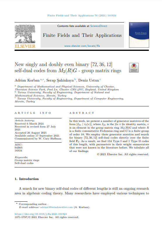 Korban, A., Şahinkaya, S. ve Üstün,D. (2021). New singly and doubly even binary [72,36,12] self-dual codes from M2(R)G - group matrix rings,Finite Fields and Their Applications,76. Erişim adresi: https://doi.org/10.1016/j.ffa.2021.101924.